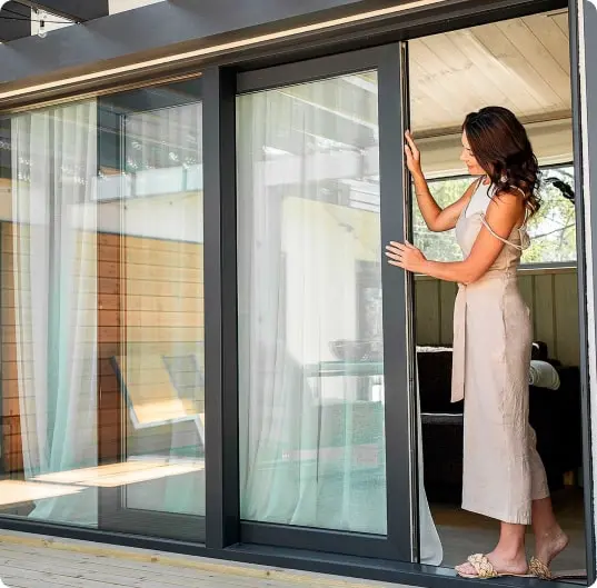 Параллельно-раздвижные системы от Рехау — уникальное решение, обеспечивающее не только легкость открывания, но и превосходную водонепроницаемость. Intelio Slide задействуют как в роли панорамных окон, так и в качестве двери. Благодаря удобной функции открывания вы сможете грамотно использовать пространство, так как в открытом положении дверь не занимает место в помещении.