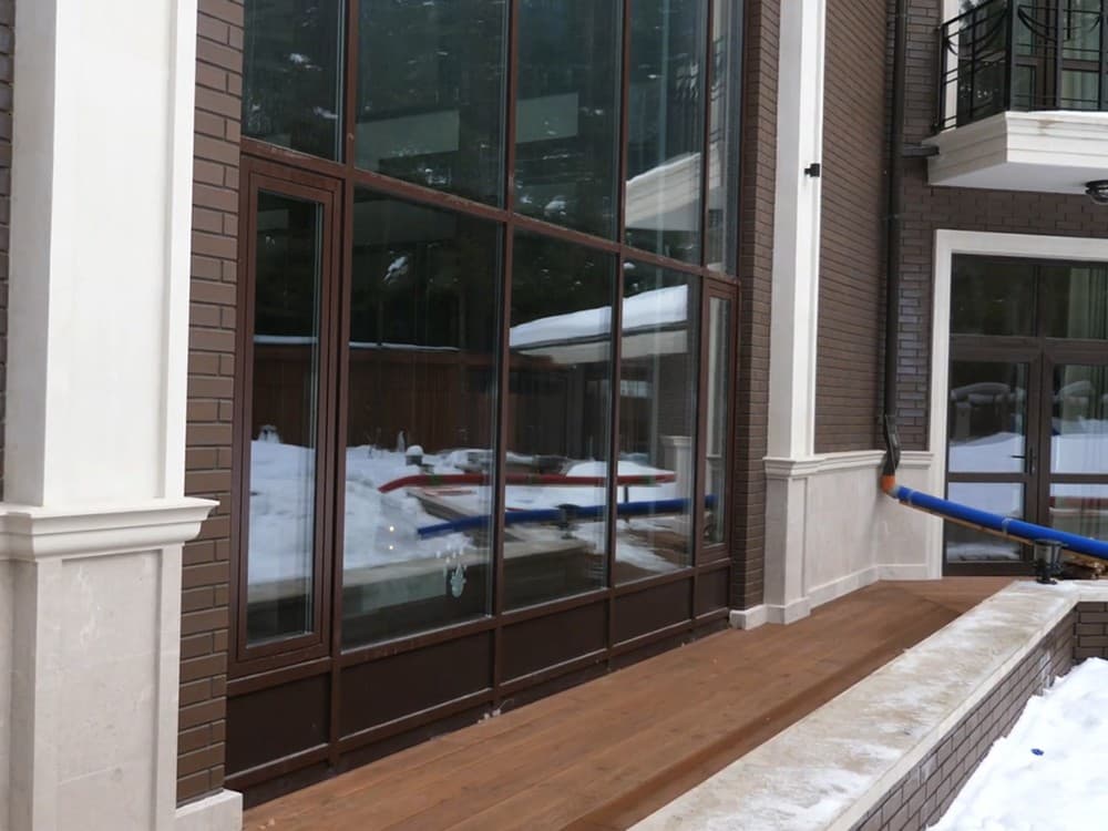 Выполненные работы: Установлено 16 панорамных окон, Ламинация изделий под дерево, профильная система REHAU Delight и Brillant, Остекление 6 входных групп, Противовзломная фурнитура Siegenia Titan AF, Стеклопакет 40 мм с i-стеклом
